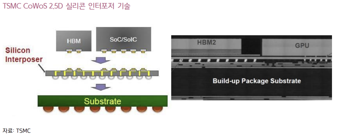 1. CoWoS란 무엇인가? CoWoS는 2.5D 패키지 기술을 의미하는 TSMC의 브랜드명으로, 2개 이상의 반도체 칩을 웨이퍼 상에서 상호 연결한 뒤 패키지 기판에 올린다는 뜻이다. 따라서 CoWoS 역시 기존 2.5D 패