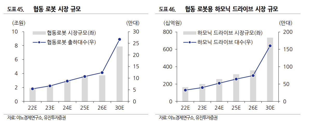 협동 로봇 시장이 본격적으로 확대되고 있는 점도 신흥 감속기 제조 기업들에 긍정적이다. 동 시장은 2022년 5만대 규모에서 2030년 27만대로 연 22%(2022~2030 CAGR)의 고성장을 기록할 것으로 전망된다. 협동 로봇 자체가 소형 로봇인 만큼 전 축에 하모닉 드라이브가 활용될 것이며, 이 에 따라 협동 로봇용 하모닉 드라이브 시장 규모는 2020년 13만대, 0.1조원 수준에서 2030년 160 만대, 0.8 조원 수준으로 확대될 것이다.