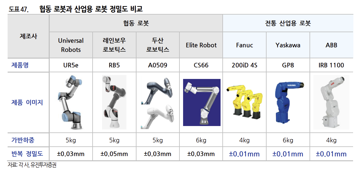 협동 로봇은 동작 속도 및 가반 하중, 정밀도 관점에서 전통 산업용 로봇 대비 뒤떨어지지만, 안전성과 저렴한 가격, 사용자 편의성을 갖춘 보급 확장성이 뛰어난 로봇으로 기술보다도 가격적인 측면이 부각되는 로봇 유형이다. 그리고 기존 로봇 기업(Fanuc, Yaskawa, Kawasaki, ABB, Kuka 등) 보다 Universal Robots(덴마크), Techman Robot(대만), JAKA Robots(중국), 두산 로보틱스(한국), 레인보우로보틱스(한국) 등의 협동 로봇 전문 기업들의 존재감이 더 크다.