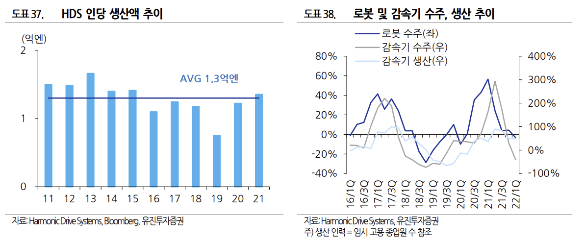 로봇 기업들은 이번에도 마찬가지로 로봇 수요 증가에 대비하고자 선행 발주를 늘린 상황이다. 그 리고 2022 년 2 분기 일본 로봇 수주 총액이 8 분기만에 하락세로 돌아서며 로봇 수요의 피크 아웃 이 다가옴에 따라 감속기 발주 조정에 나서기 시작했다. 이에 따라 HDS 의 수주는 또 다시 크게 감소하기 시작했고 동사의 2022년 수주액은 310억엔 수준으로 전년대비 60% 감소하고, 수주잔고 는 전년대비 80% 감소한 100 억엔 수준을 기록할 것으로 추정된다(2018 년 수주 감소폭 적용 시).