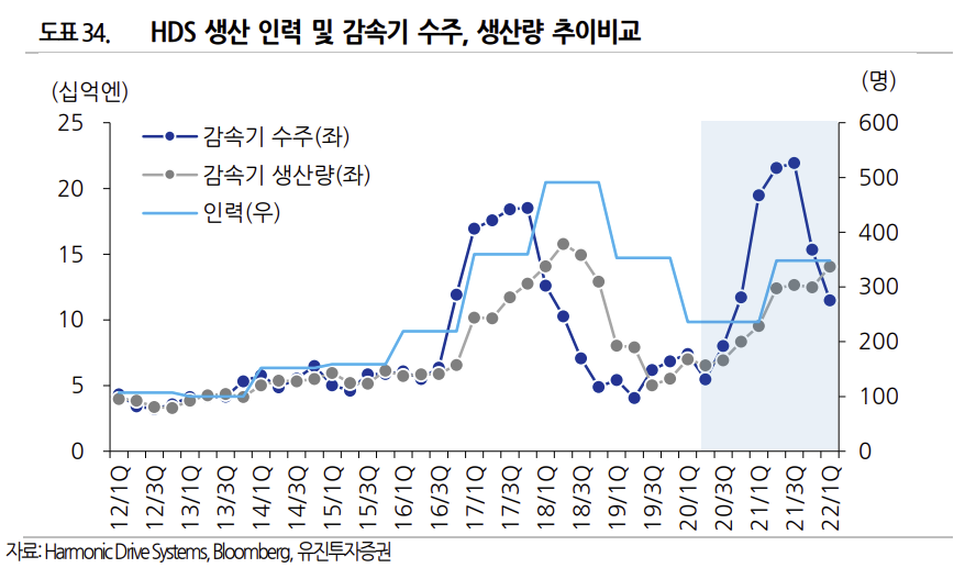 2021년 이후 산업용 로봇 시장의 수요가 증가하면서 소형 정밀 감속기에 대한 수요도 높아지고 있지만, HDS 는 이에 충분히 대응하지 못하는 모습을 보이고 있다. HDS의 2021년 감속기 수주액은 783 억엔으로 전년대비 140% 증가한 반면 생산량은 471 억엔을 기록하며 전년대비 63% 늘어나는 데 그쳤고, 2021 년 말 수주 잔고는 405 억엔으로 전년대비 290% 늘어난 상황이다.