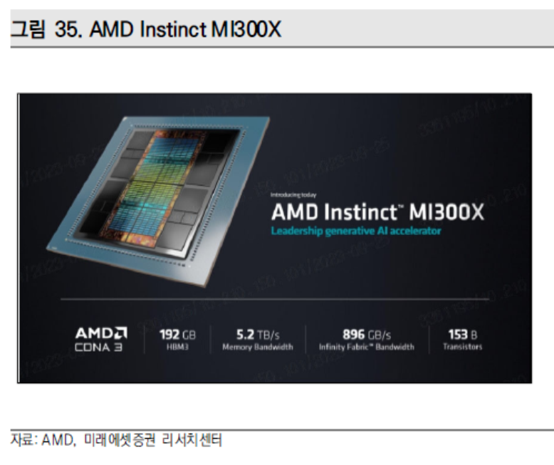 MI300X는 올해 6월에 출시한 AI 애플리케이션용 AMD의 최신형 GPU이다. MI300X는 차세대 AMD CDNA 3 가속기 아키텍처를 기반으로 하며 생성 AI 학습 및 추론과 대형 언어 모델 훈련에 필요한 컴퓨팅 및 메모리 효율성을 제공하기 위해 최대 192GB의 HBM3 메모리를 지원한다. AMD Instinct MI300X의 대용량 메모리로 고객들은 이제 MI300X 가속기5 하나에 400억 parameter 모델인 Falcon-40과 같은 LLM을 장착할 수 있다.