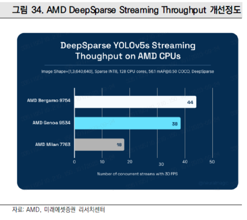AMD EPYC 9004 Series 프로세서는 YOLOv5s 워크로드에서 "Zen 4c" 코어로 구동되며 이전 4세대 AMD EPYC 프로세서의 성능과 필적할 뿐만 아니라 이를 능가하여 스트림당 최대 33ms(30FPS)의 최대 지연 시간으로 더 많은 이미지 객체 검출 스트림을 구현했다. 더욱 놀라운 것은 4세대 AMD EPYC 프로세서가 보여주는 세대별 개선이다. 3세대 이전 프로세서와 비교할 때 AMD EPYC 프로세서는 2.4배의 성능 향상을 달성했으며 이는 데이터 센터가 DeepSparse를 사용할 때 발생하는 랙/전력/통화 예산의 전체 비용 감축 및 에너지 효율성 최적화를 통해 이루어진 것으로 보인다.