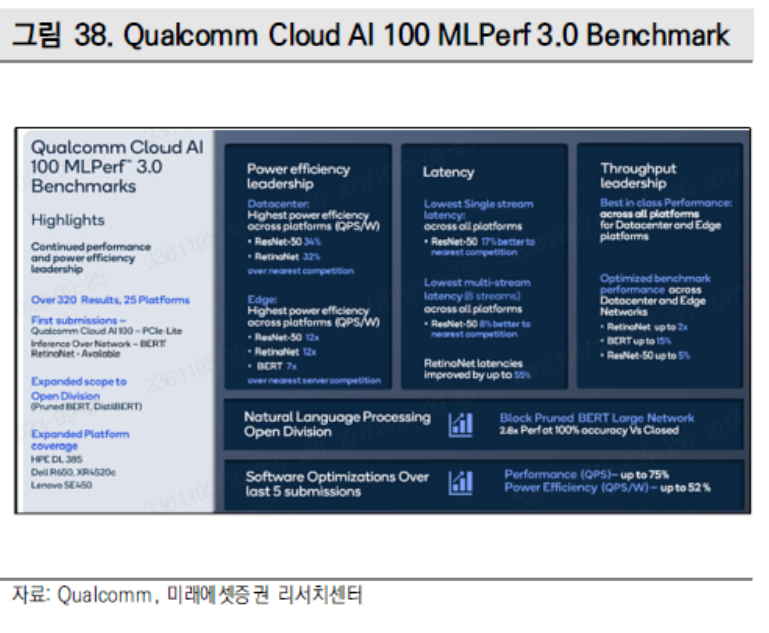 항간에서는 Qualcomm의 Cloud AI 100이 Nvidia의 H100을 성능면에서 앞섰다는 분석이 제기된다. 두 기업의 AI Chip이 이미지 식별과 관련해 와트당 수행하는 쿼리의 수를 테스트한 결과, AI 100이 197.6 쿼리를 수행한 반면 H100은 108.4 쿼리에 그쳤으며 이에 더해 Qualcomm은 객체 탐지 부문에서도 Nvidia에 앞선 것으로 나타났다.