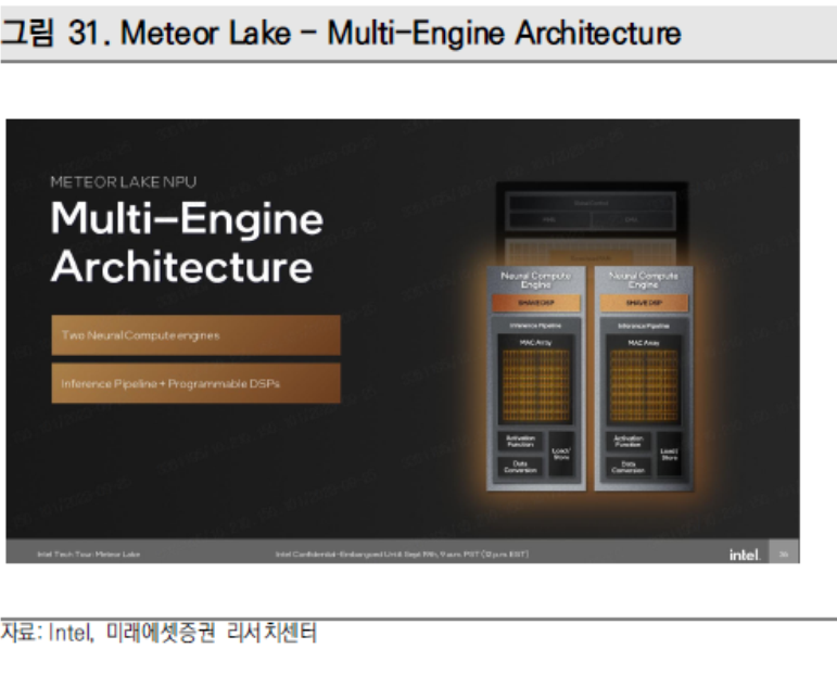 코드네임 메테오 레이크(Meteor Lake)의 PC Inference향 Intel Core Ultra Processor는 인텔의 첫 번째 NPU로써 12월 14일 출시 예정이다. Core Ultra는 Foveros 패키징 기술에 의해 만들어진 최초의 클라이언트 Chiplet 디자인 제품으로서 인텔의 클라이언트 프로세서 로드맵의 변곡점을 기록할 것으로 보인다. Core Ultra는 NPU와 전력 효율적인 성능의 주요한 발전에 더해 내장된 인텔 Arc그래픽 기반 독보적인 수준의 그래픽 성능을 제공할 것으로 보인다.