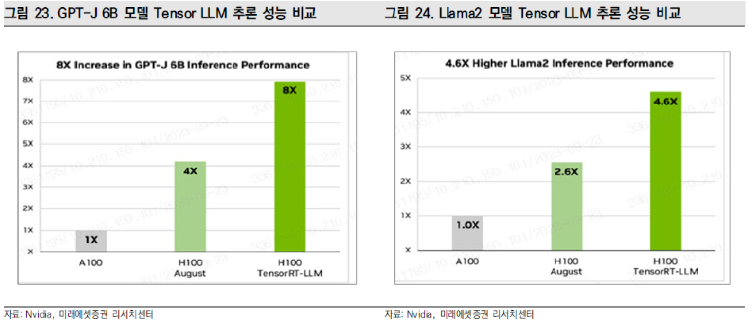 Nvidia의 GH200은 Nvidia의 현재 최고급 AI 칩인 H100과 동일한 GPU를 가지고 있지만 141Gb의 최첨단 메모리 및 72코어 ARM 중앙 프로세서와 페어링이 가능한 제품이다. AI Inference 용 칩으로 설계된 GH200은 기존 제품 대비 더 많은 메모리 용량을 가지고 있으며, 이에 더 큰 AI 모델이 단일 시스템에 들어갈 수 있다. Nvidia의GH200의 메모리 Capa는 H100의 80GB 메모리 대비 거의 두배에 육박하며 2Q24 Nvidia의 유통업체를 통해 판매될 계획이다.