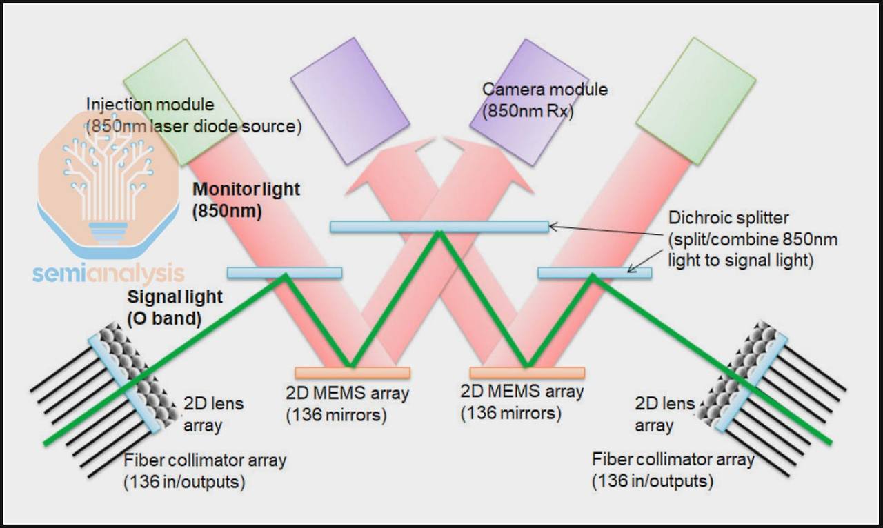 OCS의 작동 원리는 기존의 전자 패킷 스위치(EPS)와 근본적인 차이를 보입니다. EPS는 들어온 광 신호를 전기 신호로 변환하여 패킷 헤더를 읽고 라우팅 결정을 내린 뒤, 다시 광 신호로 변환하여 내보내는 과정을 거칩니다. 반면, OCS는 신호 변환 과정 없이, 수많은 미세 전자기계 시스템(MEMS) 거울 배열을 이용해 입력 포트로 들어온 빛을 물리적으로 반사시켜 출력 포트로 경로를 직접 전환합니다.