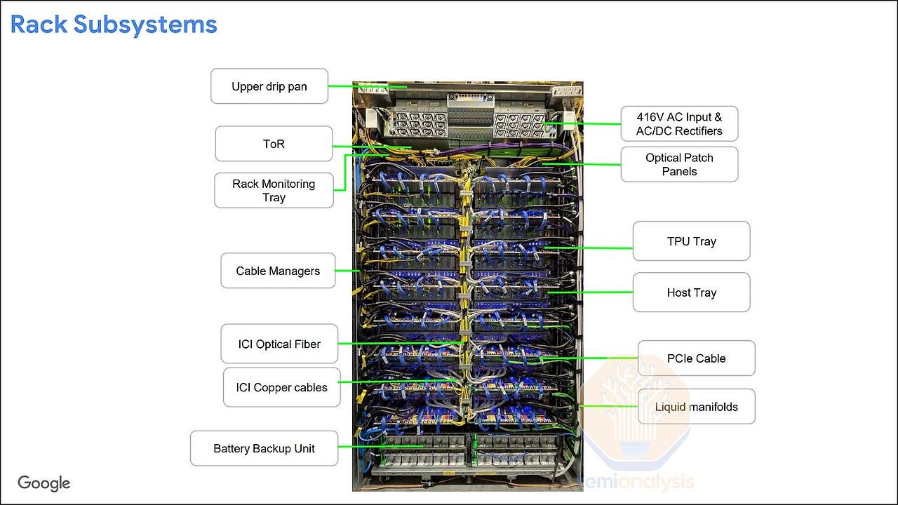 이러한 설계는 Nvidia의 NVL72와 같은 통합 시스템 철학과 의도적으로 다른 길을 갑니다. Google의 아키텍처는 복잡하고 거대한 모놀리식 백플레인을 피하고, 표준화된 외부 케이블(구리 및 광)을 통해 랙 내부 및 랙 간 연결을 모두 구현하는 방식을 전략적으로 선택했습니다.