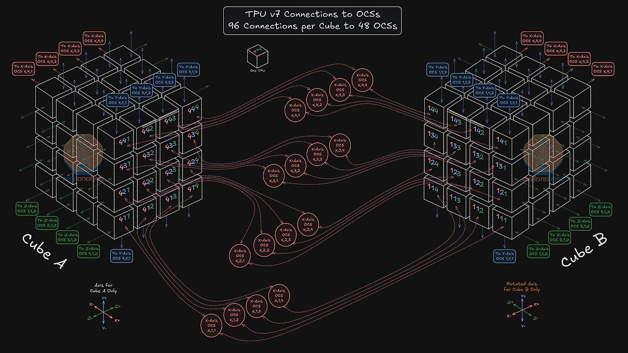 그리고 OCS를 통해 Cube A의 Z+ 방향 면에 위치한 16개 TPU의 광 연결을 Cube B의 Z- 방향 면에 위치한 16개 TPU에 직접 연결하도록 경로를 설정합니다. 동시에 Cube B의 Z+ 면은 Cube A의 Z- 면과 래핑(wrapping) 연결을 구성하여 완벽한 4x4x8 형태의 3D 토러스를 완성합니다.