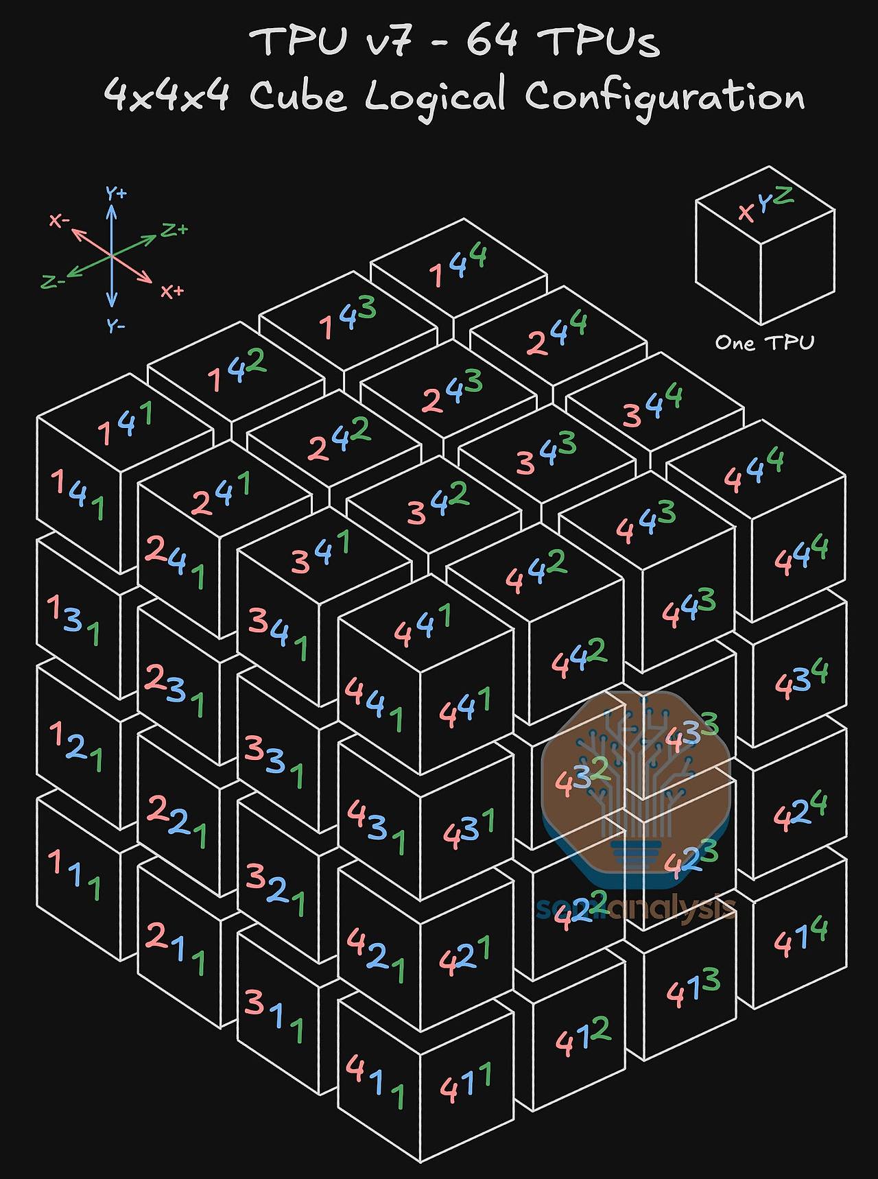 TPU v7 ICI 네트워크의 가장 기본적인 논리적 구성 단위는 '4x4x4 큐브(Cube)' 입니다. 이는 64개의 TPU가 X, Y, Z 세 축으로 배열된 정육면체 형태의 논리적 구조를 의미하며, 이 큐브 하나가 물리적으로 앞서 설명한 Ironwood 랙 하나에 정확히 매핑됩니다. 이 큐브는 랙 내부의 전기적 연결과 랙 외부의 광학적 연결을 통해 더 큰 시스템으로 확장되는 기반이 됩니다.