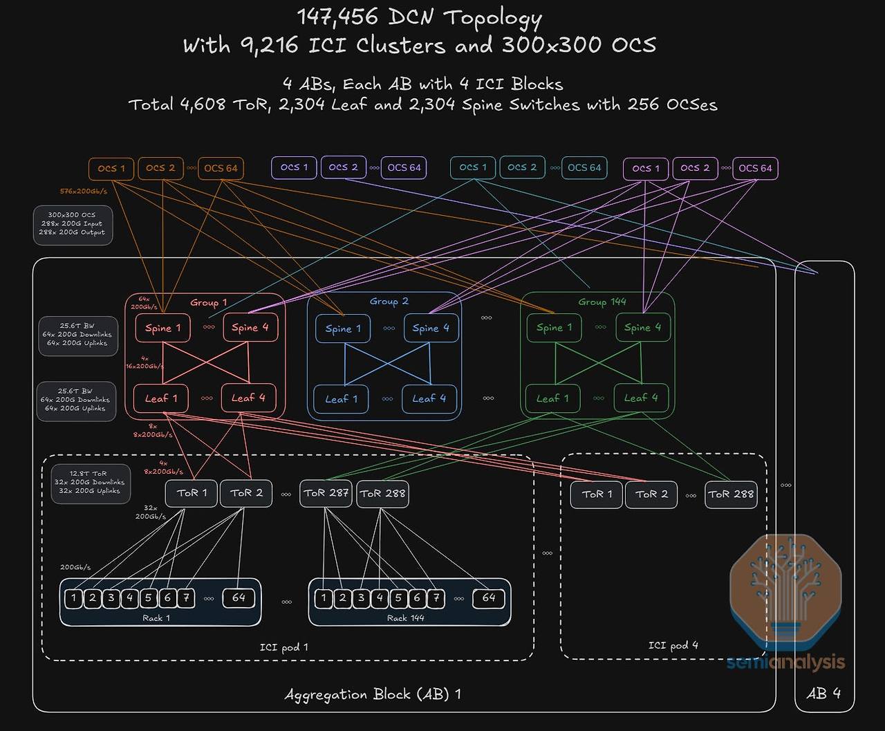 - 어그리게이션 블록 (Aggregation Block, AB): 여러 개의 ICI 포드를 하나로 묶는 중간 계층입니다. 예를 들어, 4개의 9,216-TPU ICI 포드가 스위치들을 통해 하나의 어그리게이션 블록을 형성할 수 있습니다.