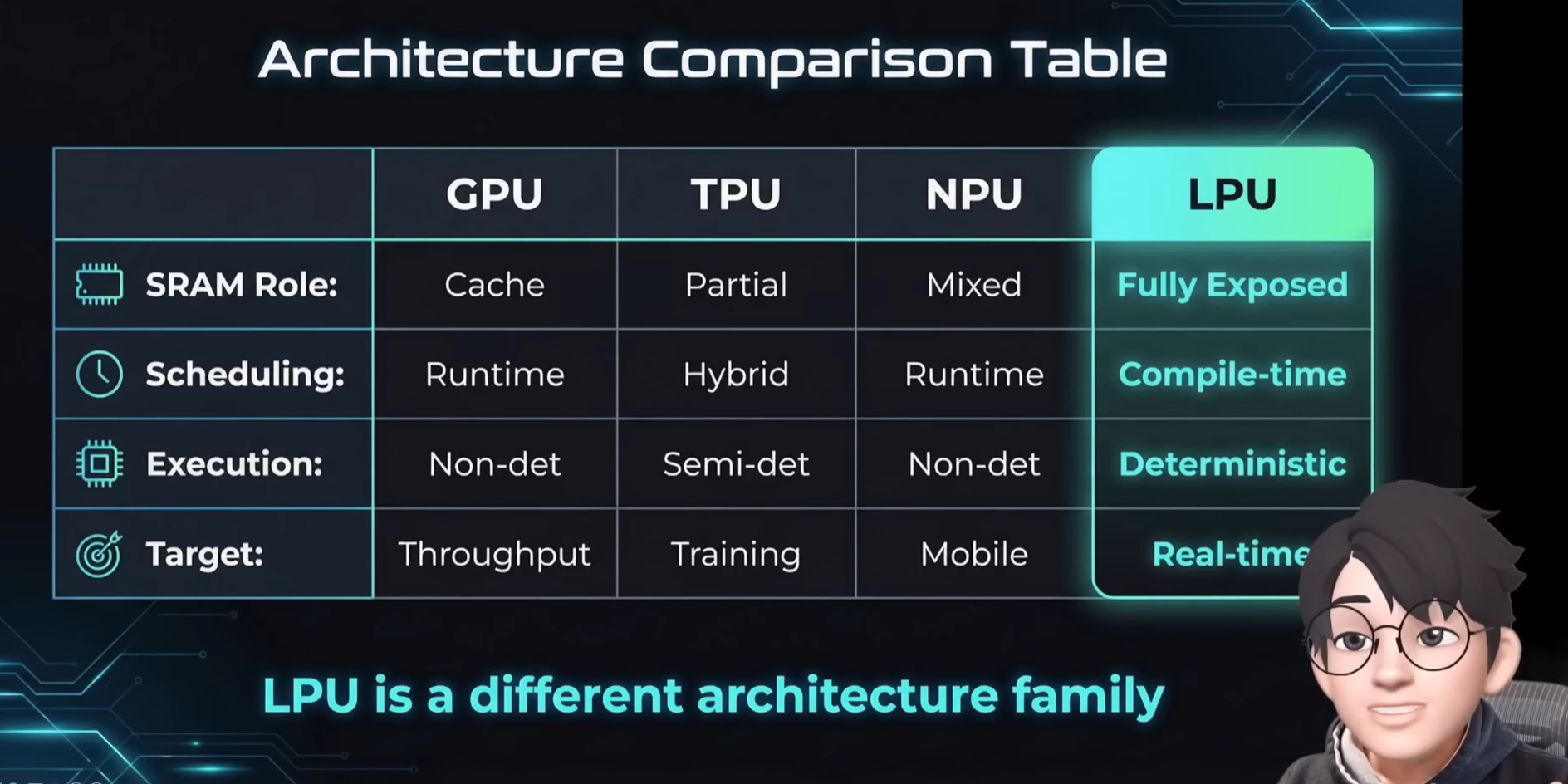 - Groq LPU: 내부 SRAM에 집중하는 특화된 구조로, 메모리 접근 속도가 생명인 실시간 추론에 최적화되어 있습니다.