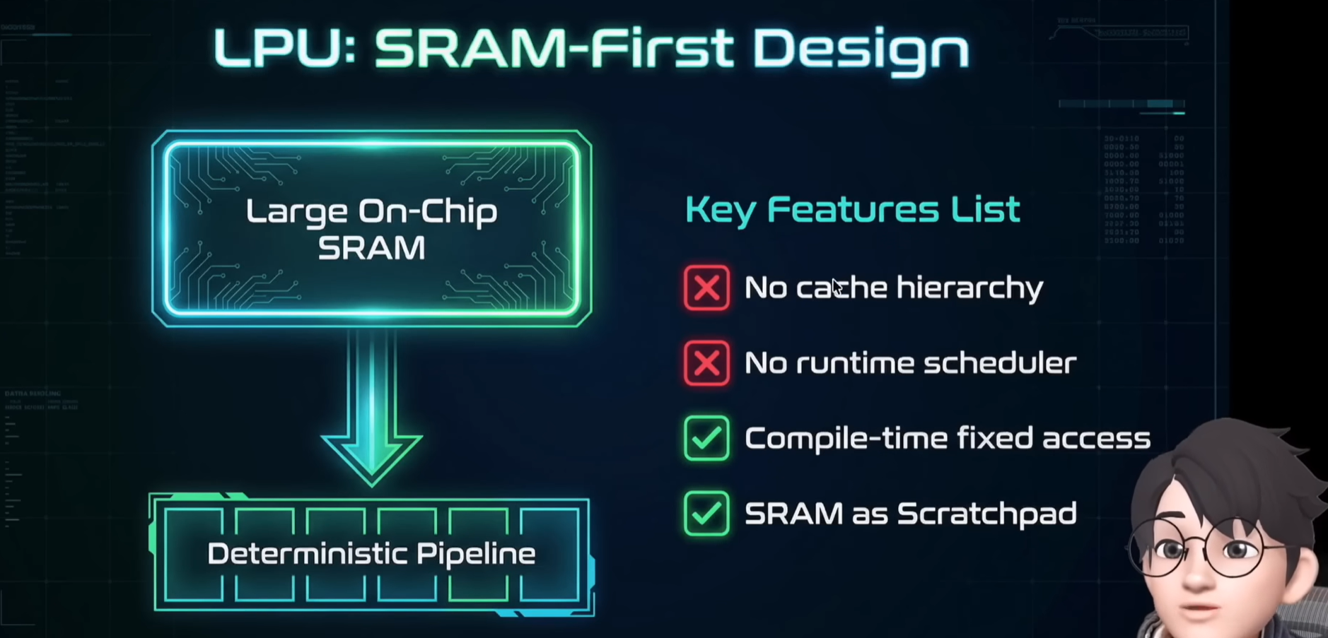 이러한 결정론적 설계는 외부 HBM을 배제하고 프로세서 내부에 통합된 SRAM(Static Random Access Memory) 만을 사용하는 혁신적인 결단 덕분에 가능합니다. 이로써 데이터가 칩 외부로 나갔다 들어오는 과정이 원천적으로 사라져 '메모리 월'로 인한 지연 시간이 구조적으로 발생하지 않습니다.