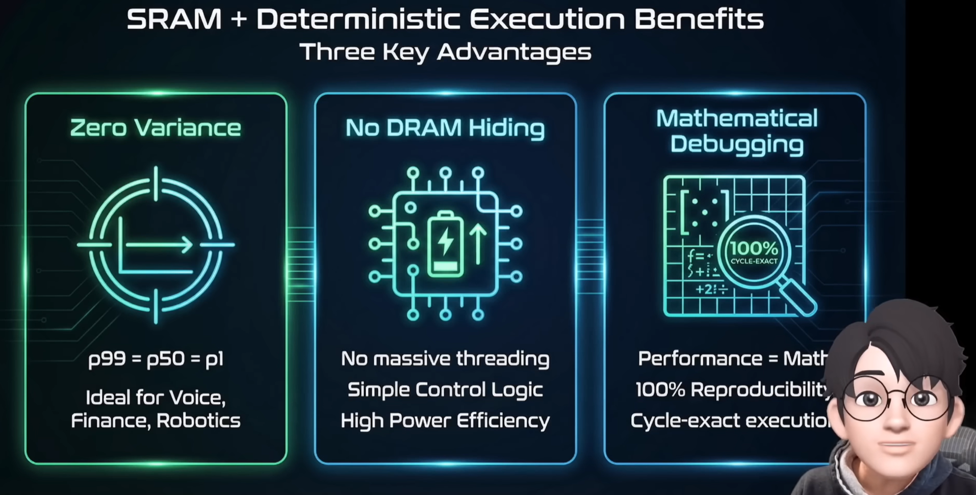 소프트웨어는 시스템 전체를 하나의 거대한 칩으로 보고, 수백 개 칩에 걸친 데이터 이동 경로와 타이밍을 나노초 단위로 스케줄링합니다. 덕분에 시스템 전체가 하나의 칩처럼 결정론적으로 작동하며, 수백 개의 칩이 한 몸처럼 움직이는 초고속 'AI 조립 라인'이 탄생한 것입니다.