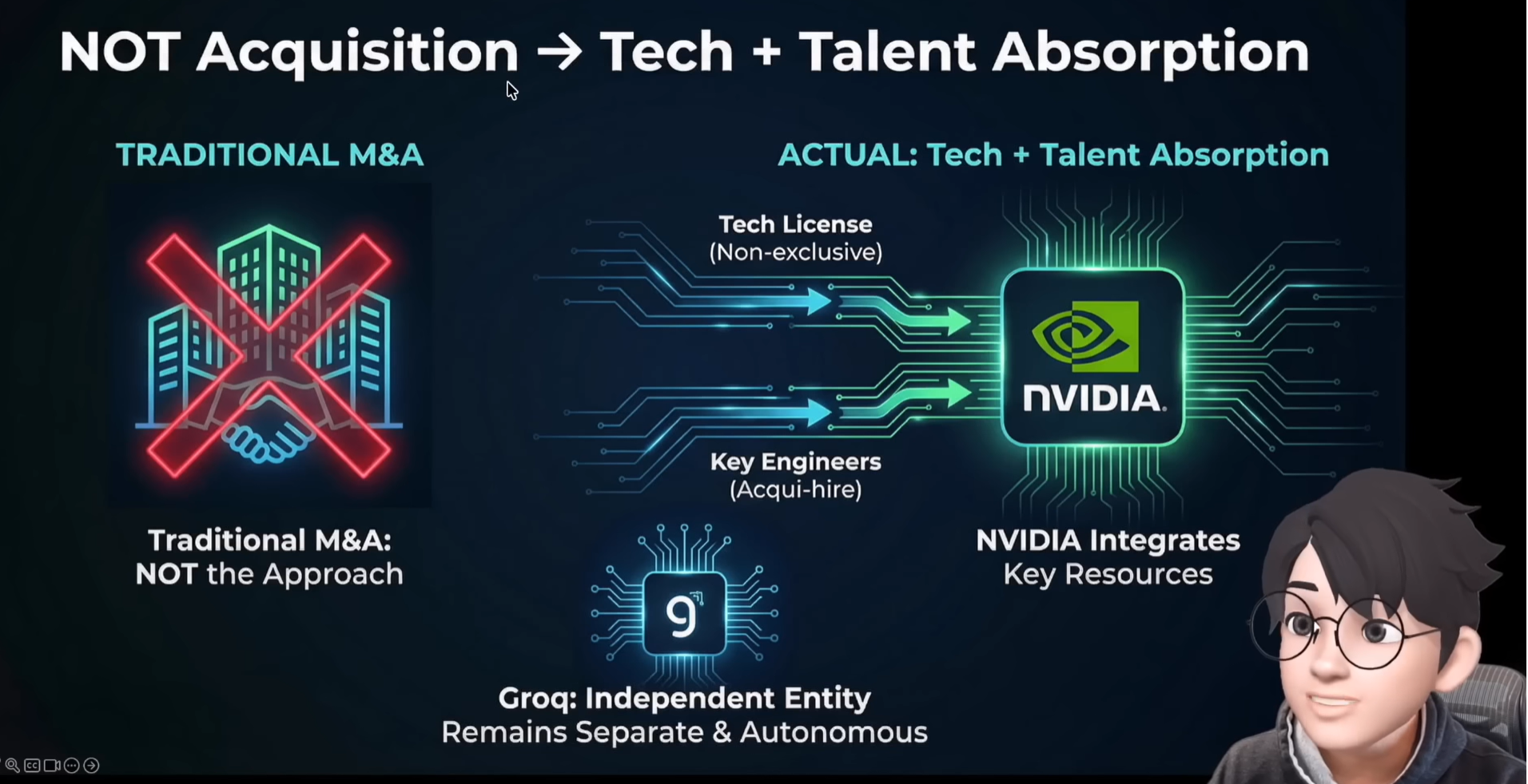 정확하게 말하면 표면적으로 인수는 아닙니다. 기술에 대한 독점적 라이센스와 핵심 인력들을 영입하되 Groq이라는 회사는 그대로 놔둔다는 것입니다. 하지만, 이것은 반독점법에 의한 제재를 회피하기 위한 방법이며, 실상은 M&A나 다름 없습니다.