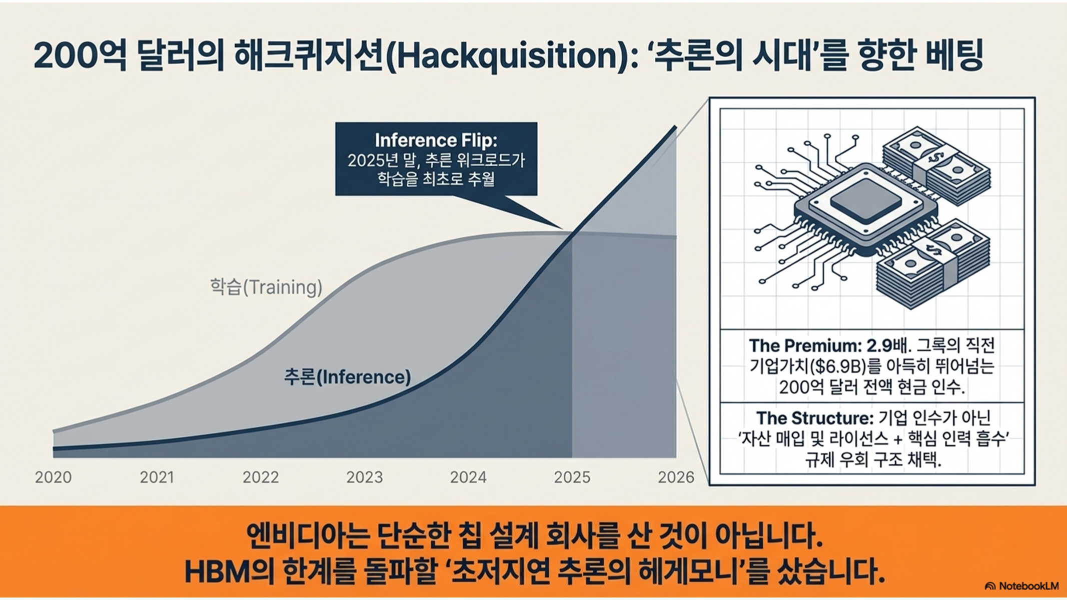 하지만 프로세서의 연산 능력이 아무리 발전해도 메모리가 데이터를 제때 공급하지 못하면 전체 성능은 하락합니다. 또한, AI 산업의 무게중심이 거대 모델의 '학습(Training)'에서 실무 서비스 구현을 위한 '추론(Inference)'으로 급격히 이동함에 따라, 엔비디아는 자사의 시장 지배력을 공고히 하기 위해 전례 없는 승부수를 던졌습니다. 2025년 12월, 엔비디아가 추론 기술의 강자였던 그록(Groq)의 자산을 200억 달러에 인수 및 라이선싱하며, 두 가지 서로 다른 메모리 철학을 하나로 통합하기 시작한 것입니다.