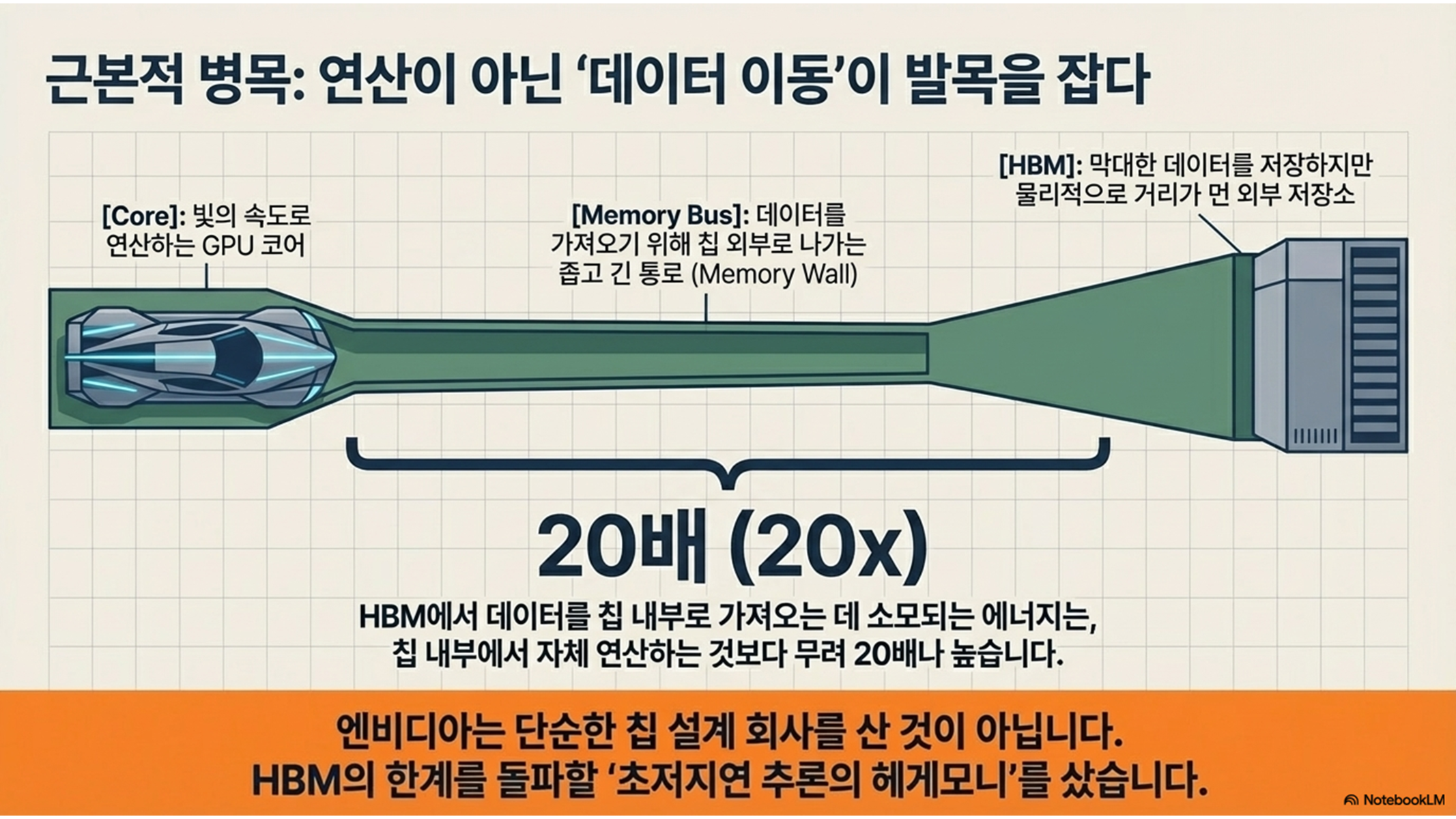 - [x] 메모리 병목의 실체: AI 속도는 데이터 이동(20배의 에너지 소모 차이)에서 결정된다.
