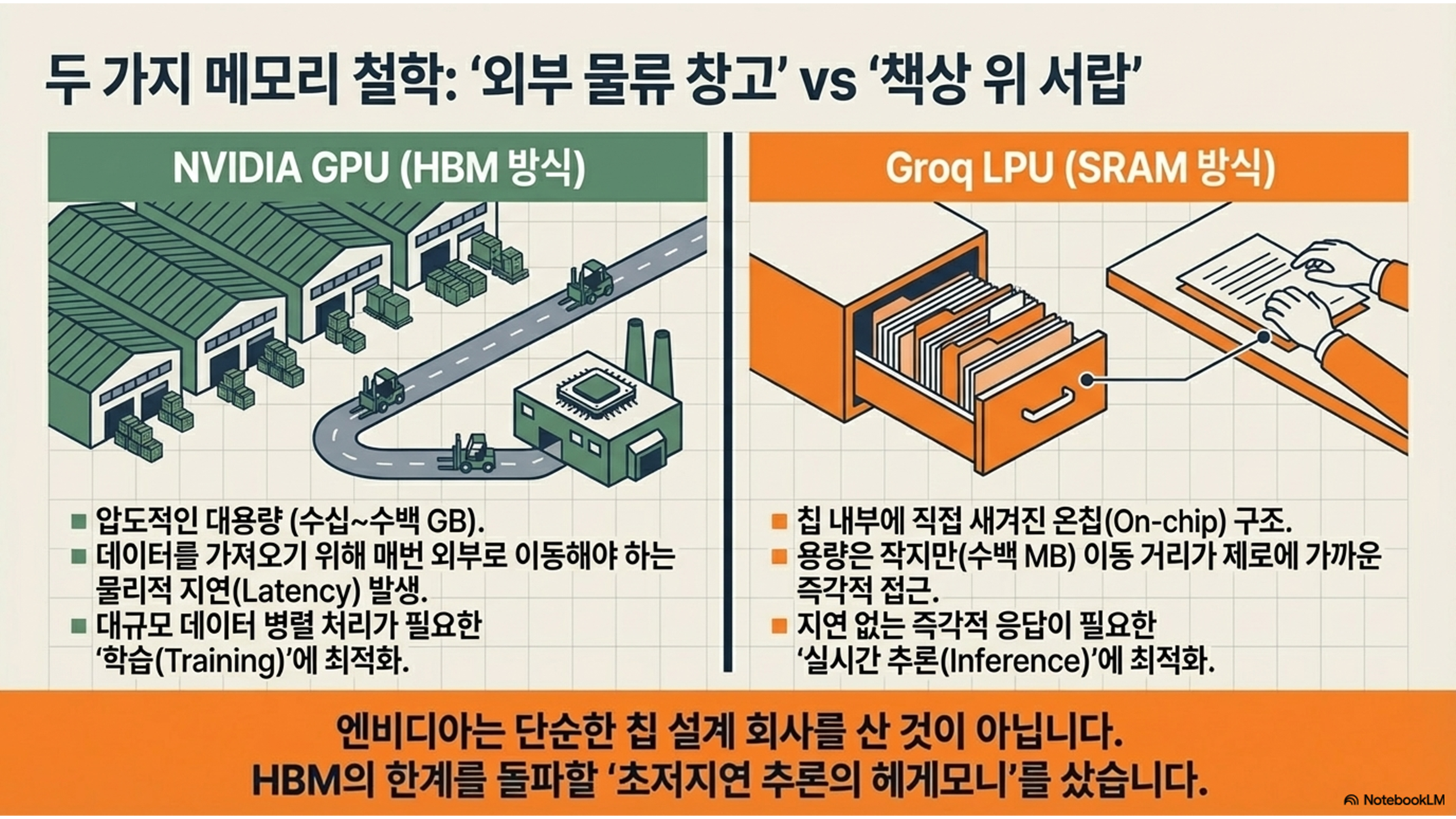- [x] 미래 전략: 엔비디아의 인수 합병은 HBM(대용량 학습)과 SRAM(초고속 추론)의 '양발 전략'을 의미한다.