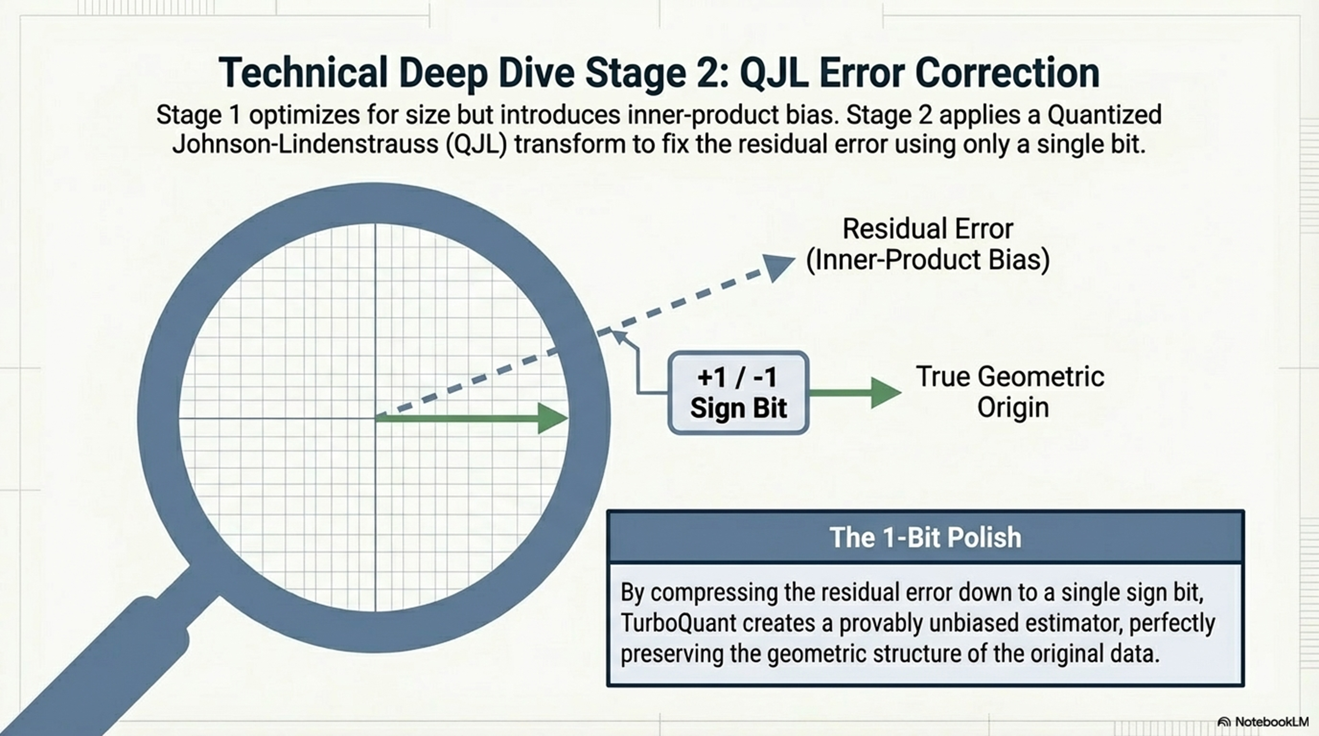 TurboQuant의 2단계 보정 기술인 **QJL(Quantized Johnson-Lindenstrauss)**은 1단계 회전 후 발생하는 미세한 잔류 오차(Residual Error)를 이론적 한계치까지 제어합니다.