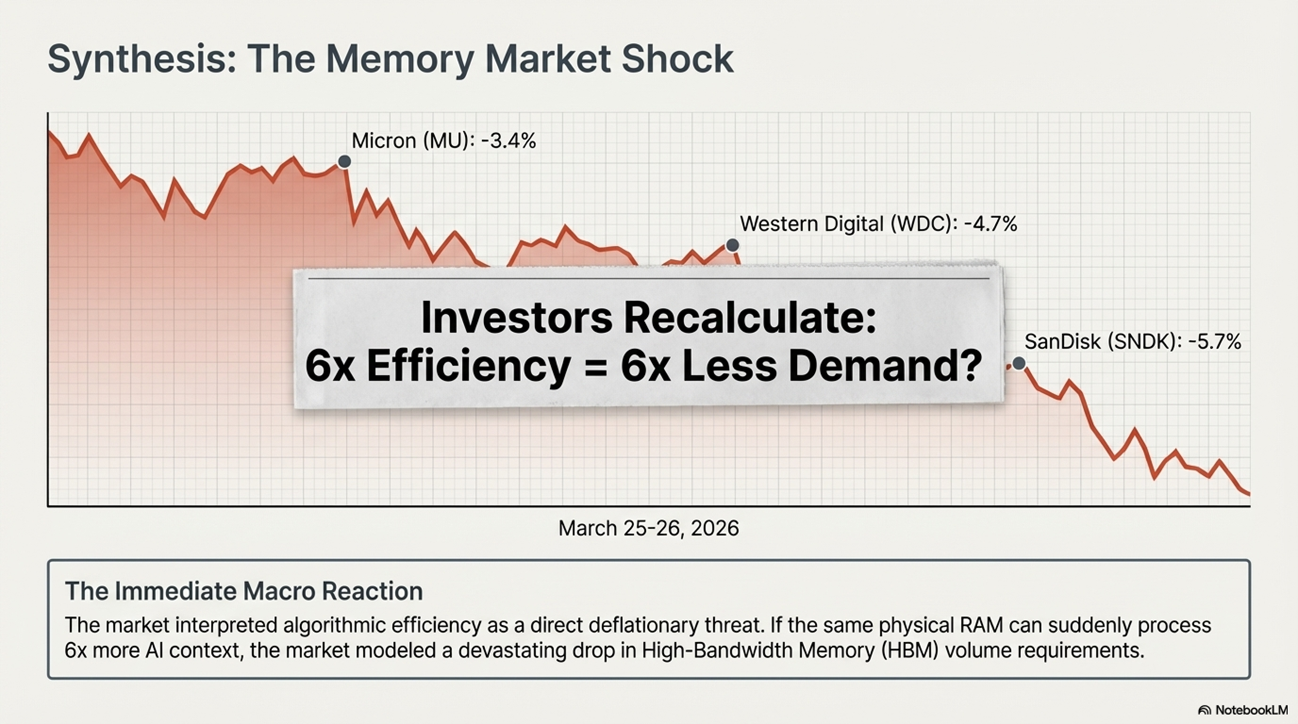 2026년 3월 25일, TurboQuant의 효율 혁신이 하드웨어 수요를 파괴할 것이라는 오판으로 SK Hynix(-5.9%), Micron(-3.4%), Western Digital(-4.7%) 등 주요 제조사의 주가가 급락하는 '시장 패닉'이 발생했습니다. 그러나 이는 경제학의 **'제번스의 역설(Jevons Paradox)'**을 간과한 결과입니다.