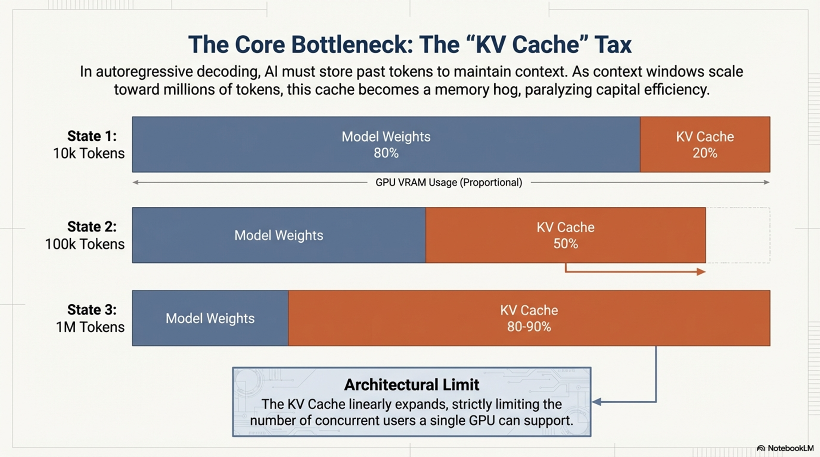 현재 대규모 언어 모델(LLM) 추론 환경에서 GPU의 자본 효율성을 저해하는 가장 치명적인 병목은 연산 속도가 아닌 'KV 캐시(Key-Value Cache)의 점유' 문제입니다. 자기회귀(Autoregressive) 디코딩의 특성상 문맥 유지에 필요한 데이터는 선형적으로 증가하며, 이는 하드웨어 리소스의 심각한 불균형을 초래하고 있습니다.