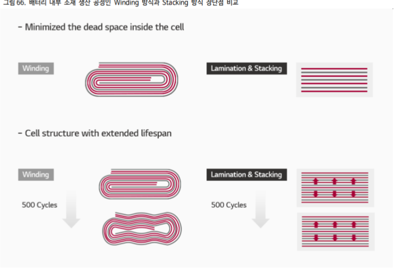 중장기적으로는 Gen6, Gen7 으로 넘어가면서 양극재 nickel 비중을 90% 이상으로 높이는 것을 목표로 하고 있다. 또한 다른 변화 중 하나는 배터리 내부 소재(양극재, 전해질, 분리막, 음극재) 생산 공정을 기존 Winding 방식에서 쌓아 올리는 형태인 Stacking 방식으로 변경 적용하는 것이다.